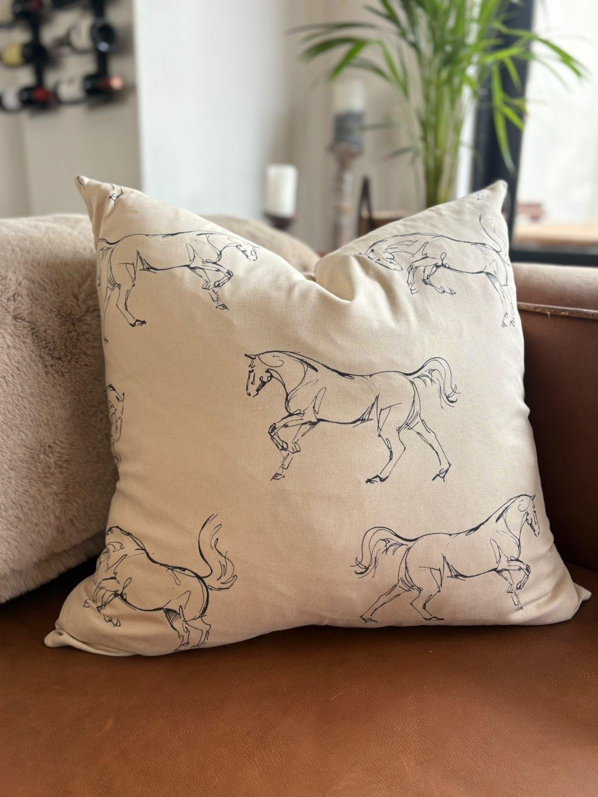 Made from 100% cotton, this cushion features a sophisticated equestrian pattern with a natural cotton finish that will effortlessly complement any décor. The neutral colour and charcoal print adds a sophisticated blend of the energy of playful horses along with the elegance of the horse making it the perfect accessory for your living room, bedroom, or a cozy corner.